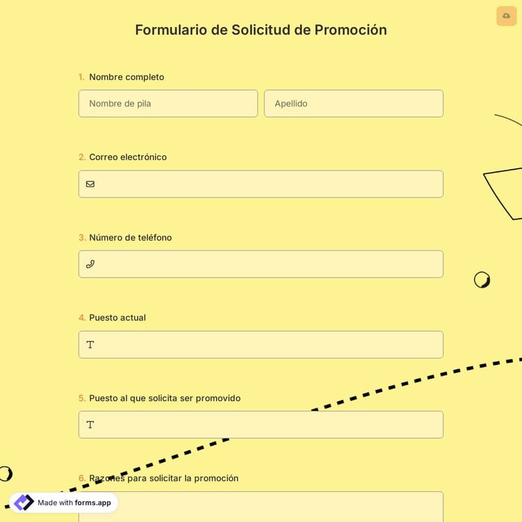¿Estás tratando de descubrir cómo crear un formulario de solicitud de promoción? forms.app te ayudará a crear tu formulario de solicitud de promoción según tus necesidades. ¡Puedes empezar de inmediato haciendo clic en el botón "Usar modelo" hoy!