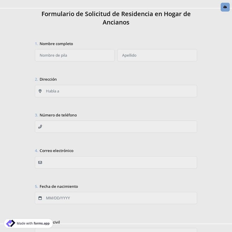 Crear formularios de solicitud para residencias de ancianos es ahora muy fácil con forms.app. Acelere el proceso creando estos formularios que no requieren ningún conocimiento en codificación. Comience eligiendo el modelo de formulario de solicitud para residencia de ancianos gratuito de forms.app y úselo como base para su formulario.