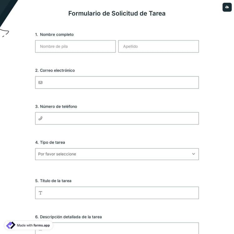 Los formularios de solicitud de tarea reducen tu carga de trabajo y mejoran la organización, ya sea que seas un líder de equipo o los utilices personalmente. Este formulario también mejora las relaciones con tu equipo y las hace más claras. Comienza a crear formularios más personalizados y profesionales con los modelos de formulario de solicitud gratuitos de forms.app para mejorar y optimizar tu flujo de trabajo hoy mismo!