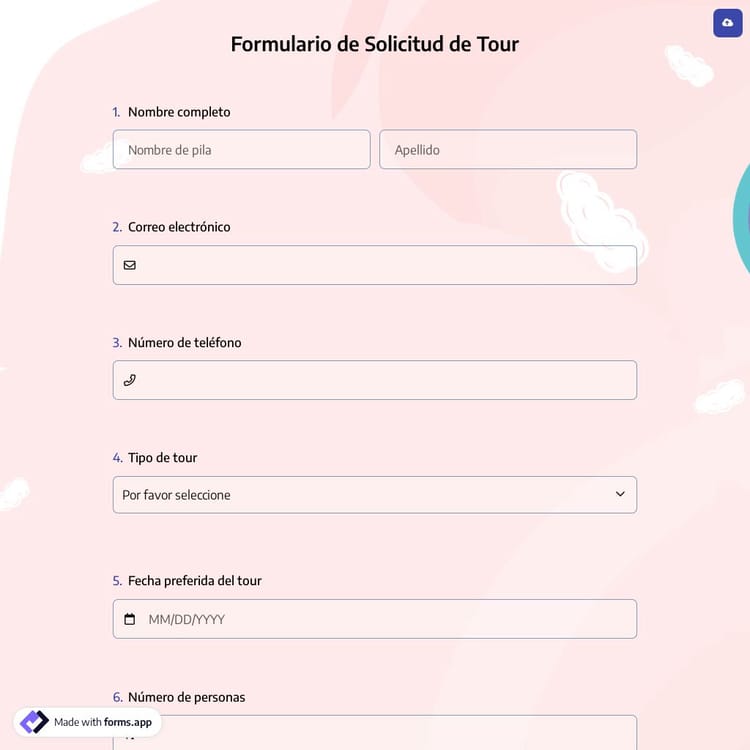 Si está buscando una forma efectiva de recopilar solicitudes para una guía turística o agencia de viajes, este modelo de formulario de solicitud de visita gratuito es perfecto para usted. Con él, puede ofrecer un servicio profesional a sus clientes. Además, forms.app ofrece varias funciones de personalización y opciones de uso compartido. Para comenzar a crear su formulario de solicitud de visita, haga clic en el botón "Usar modelo".