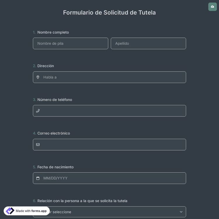 Obtener la tutela de un padre o de alguien que conoce a menudo no es un proceso fácil para los solicitantes. forms.app proporciona todos los campos necesarios en el modelo de formulario de solicitud de tutela, y puede crear un formulario en pocos minutos. ¡Comience a usar forms.app con modelos de formulario completamente gratuitos!
