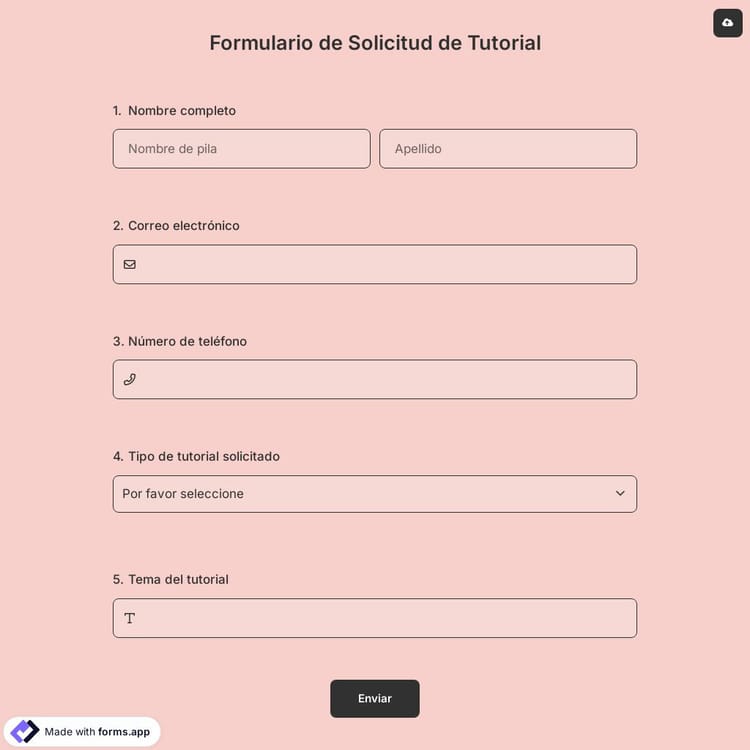 Las personas pueden utilizar el formulario de solicitud de tutorial para solicitar ayuda adicional en la comprensión de un tema. Puedes compartir este formulario de solicitud de tutorial con tu audiencia que desee seguir tutoriales para una serie de cursos. Edita las preguntas y agrega nuevas a este formulario de solicitud de tutorial según tus necesidades. Edita el diseño con decenas de temas y crea tu formulario de solicitud de tutorial en segundos en forms.app.
