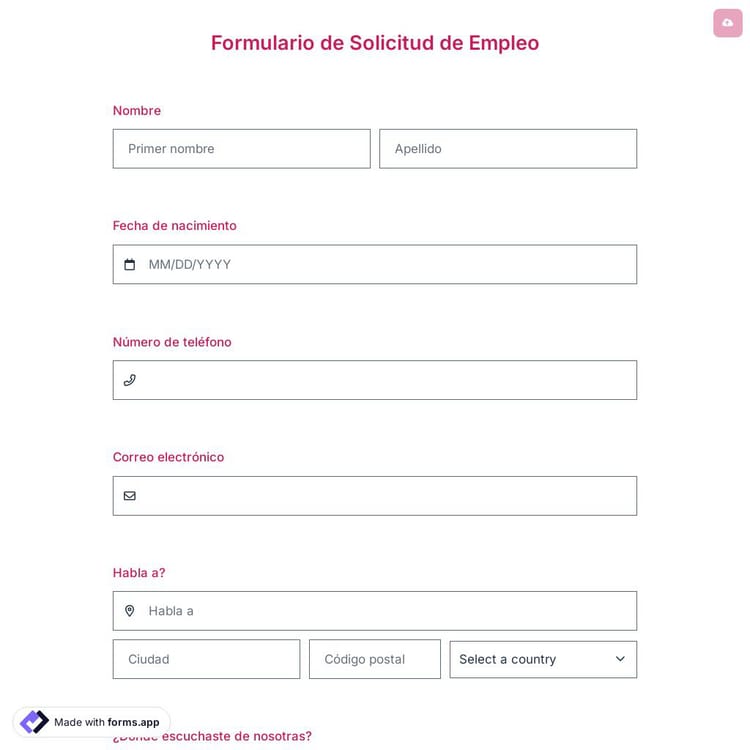 Con forms.app, puede recopilar las solicitudes de empleo en línea y mostrar la experiencia, la información de contacto, la carta de presentación y los antecedentes de los solicitantes de empleo en cualquier dispositivo que desee.