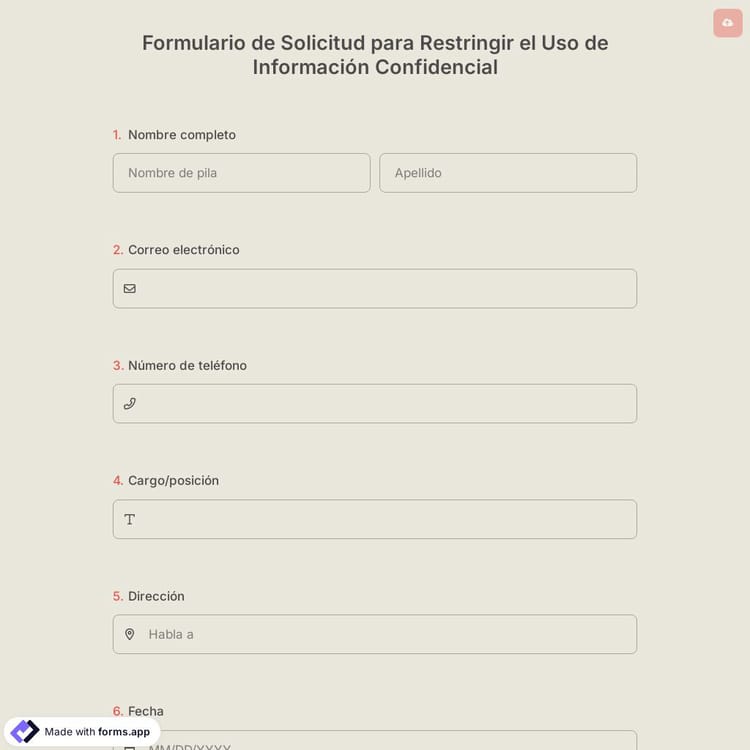 Con los formularios en línea, puede recopilar envíos con un formulario de solicitud de información confidencial y sensible que debe mantenerse seguro. Utilice la plantilla gratuita de formulario de solicitud de restricción de forms.app para el uso de información confidencial y cree su formulario para proteger y garantizar la seguridad de la información privada. ¡Cree su formulario en línea hoy mismo y ofrezca servicios más seguros!