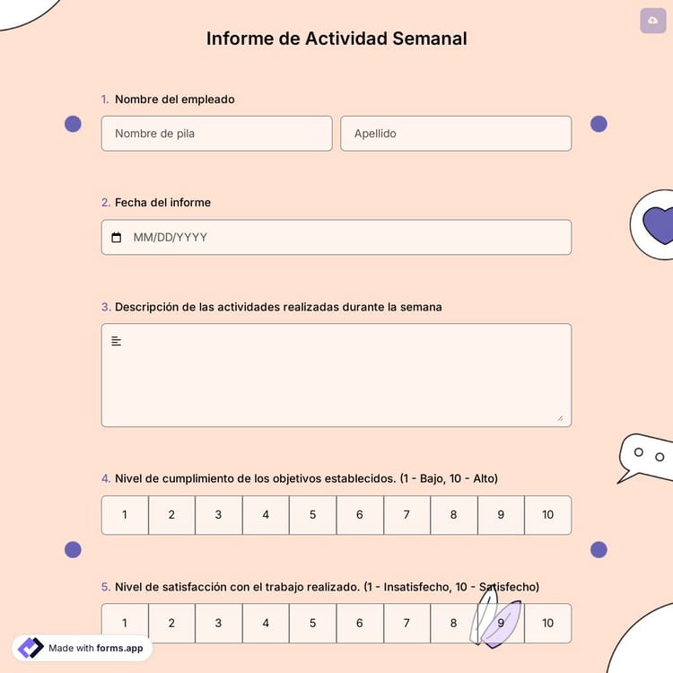 ¿Necesita una plantilla de informe de actividad semanal en línea para su uso personal o laboral? forms.app es una herramienta de formulario gratuita perfecta para ti. Si está pensando en crear un informe de actividad semanal, comience utilizando la plantilla gratuita en forms.app.