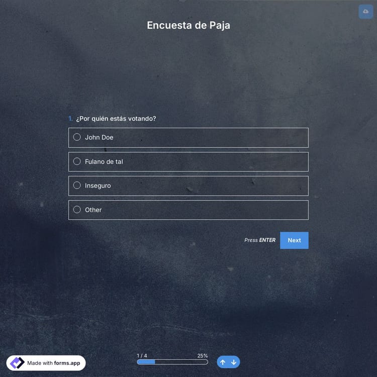¿Se pregunta qué piensa la gente sobre un asunto? Utilice esta plantilla de encuesta gratuita en forms.app para crear su encuesta en línea y ver si el público apoya la idea / persona o no. Recopile votos no oficiales y evalúe mejor la situación de acuerdo con los resultados.