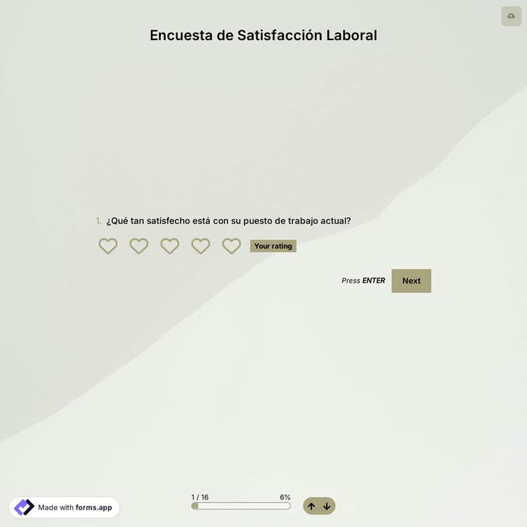 Para trabajar de manera productiva y con entusiasmo, los empleados deben estar satisfechos con su trabajo. Dado que muchos factores pueden afectar la experiencia y satisfacción de los empleados, es su trabajo verificar los niveles de satisfacción con regularidad. ¡Pero no te preocupes! ¡La plantilla de encuesta de satisfacción laboral en línea gratuita en forms.app lo ayudará a comenzar de manera fácil y sin esfuerzo!