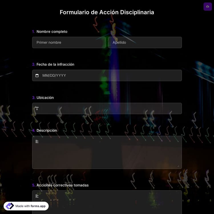 Es posible que necesite usar un formulario de disciplina para muchas situaciones diferentes. Como docente o como directivo, debe registrar las infracciones cometidas en el ámbito laboral. forms.app le ofrece una plantilla de formulario de acción disciplinaria gratuita para cualquier tipo de infracción. Comience fácilmente usando este ejemplo de formulario personalizable y manteniendo el orden necesario.