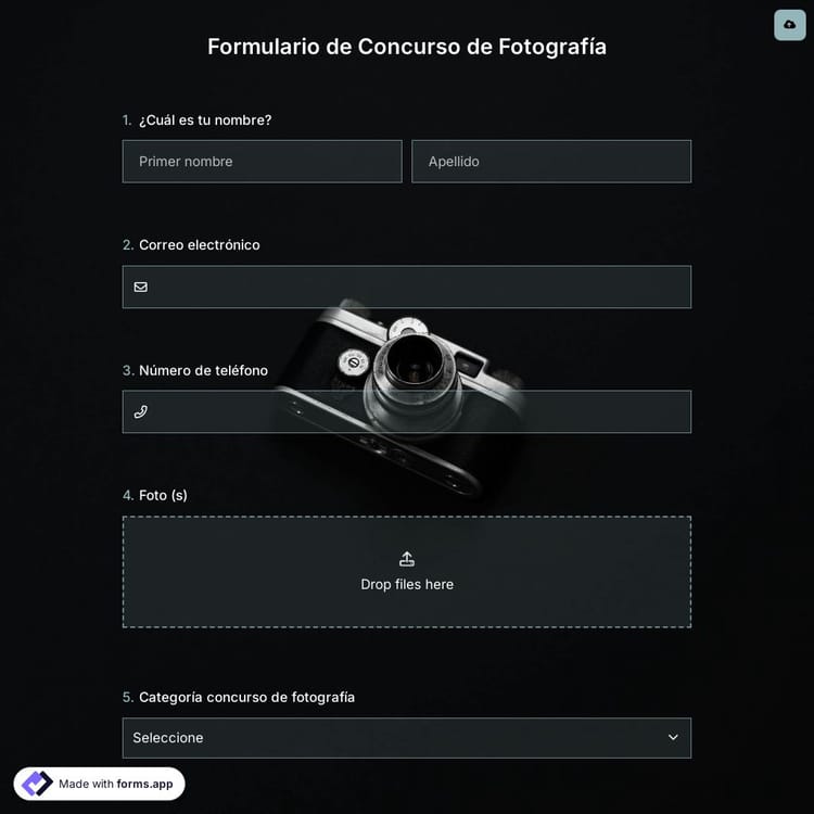 Los concursos de fotografía pueden ser divertidos y competitivos. Pero, para revisar todas esas fotos prometedoras, primero debe recopilarlas. Y forms.app le ofrece una plantilla de formulario de concurso de fotografía perfecta para crear un formulario en línea y proporcionar una manera más fácil de cargar archivos. Además, tendrás innumerables opciones avanzadas para personalizar tu formulario como quieras.