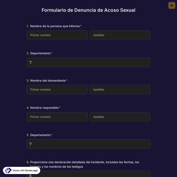 Cualquier tipo de acoso en el lugar de trabajo afecta negativamente la moral de los empleados, la imagen pública de la empresa, especialmente el acoso sexual. Por lo tanto, estos actos no deben ser tolerados y deben estar sujetos a las penas máximas. Al crear un formulario de denuncia de acoso sexual, puede permitir que los empleados escriban sobre sus experiencias y presenten una denuncia sobre el agresor.
