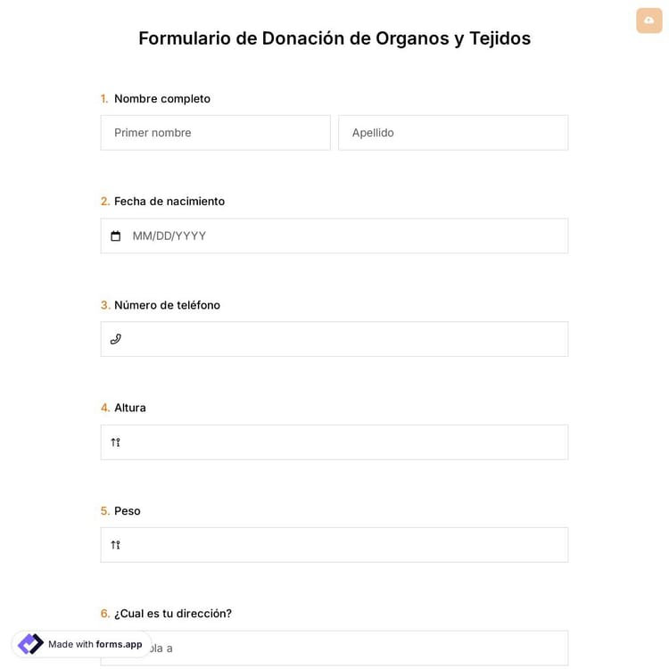 Un formulario de donación de órganos y tejidos permite a las personas elegir qué partes de su cuerpo se donarán después de su muerte. Con un formulario en línea, las personas y los pacientes podrán completar el formulario de forma libre y sin esfuerzo. forms.app proporcionará una plantilla de formulario de donación de órganos y tejidos personalizable para un inicio rápido y fácil.