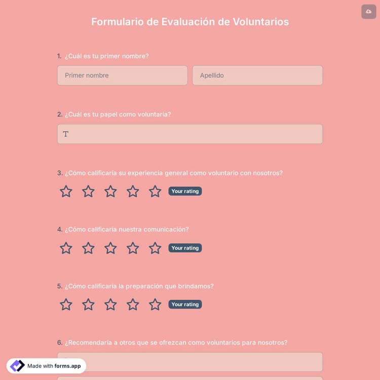 Dado que el formulario estará en línea, no tomará mucho tiempo completarlo. Además, no tendrá que lidiar con un papeleo complicado. Con forms.app, tendrá muchas opciones avanzadas con respecto al contenido y diseño de su formulario. Una vez hecho todo, también puede ver los formularios de estadísticas especiales que la aplicación ha creado para usted. Esto proporcionará una mejor comprensión de la situación. Utilice la plantilla de formulario de evaluación de voluntariado gratuita de forms.app para comenzar rápidamente.