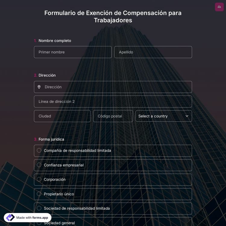 En forms.app, puede crear fácilmente su formulario de exención de compensación de trabajadores mediante el uso de plantillas. Después de crear su formulario, todo lo que tiene que hacer es compartirlo con las personas que emplea para trabajar. En aras de la profesionalidad, puede agregar el logotipo de su empresa a sus formularios, cambiar su diseño y ajustar muchas otras opciones. ¡Empiece hoy mismo con el ejemplo de formulario gratuito en forms.app!
