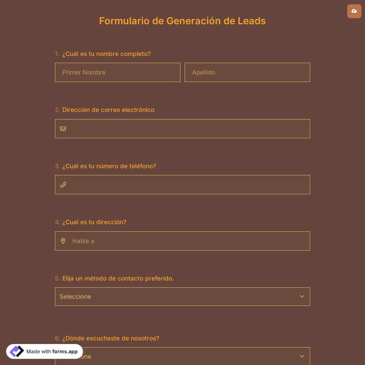 Un formulario de generación de prospectos puede tomar varias formas, como las simples para páginas emergentes o las más detalladas de una página de registro completa. Afortunadamente, encontrará todas las preguntas genéricas para la generación de clientes potenciales en el formulario de muestra. Por lo tanto, acelerará el proceso de creación de formularios web pase lo que pase. Después de iniciar su formulario personalizado de generación de oportunidades de venta, puede eliminar fácilmente las preguntas o editarlas utilizando las increíbles funciones de forms.app.