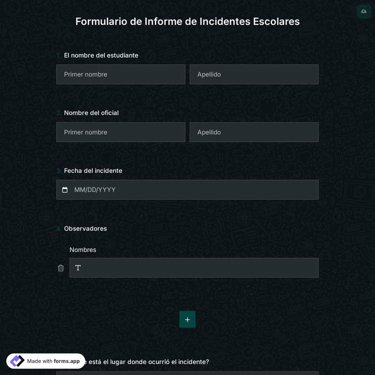 Los accidentes forman parte de nuestras vidas. Desafortunadamente, también ocurren en las escuelas. Pero hay algunas cosas que puede hacer para prevenirlas en el futuro. Todo comienza con el registro de los incidentes. Con un formulario de informe de incidentes escolares, creará un informe y capturará todos los detalles fácilmente. Dado que este formulario estará en línea, el proceso de presentación de informes será mucho más corto y la información será más precisa.