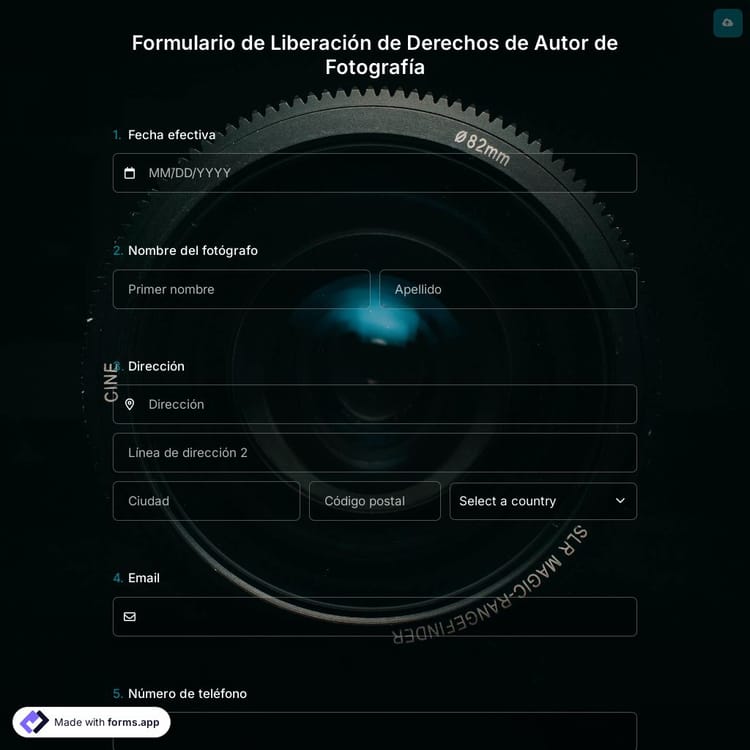 Recopilar fotografías y adquirir sus derechos de autor ahora es bastante fácil con un formulario de liberación de derechos de autor de fotografía en línea. Simplemente creando formularios en línea, podrá recopilar y utilizar fotografías en sus proyectos personales o comerciales. ¡Abra esta plantilla gratuita de formulario de liberación de derechos de autor de fotografía y disfrute de las posibilidades ilimitadas en forms.app!