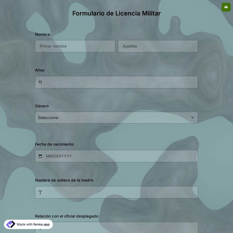 La plantilla de licencia militar de forms.app viene con campos que solicitan el nombre, el apellido, la dirección, el teléfono, el motivo de la licencia y la duración de la licencia. Puede agregar nuevas preguntas a la Plantilla de formulario de licencia militar o modificar las existentes. Si lo desea, también puede crear un nuevo formulario.