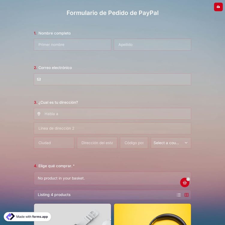 Esta plantilla de formulario de pedido de PayPal incluye todos los campos de formulario necesarios para recopilar información del cliente y vender sus productos. Pero forms.app también le permite cambiar todos los aspectos del formulario como desee. Por lo tanto, puede editar las preguntas existentes o agregar nuevas en segundos. También tendrá innumerables temas listos para usar para elegir. Simplemente iniciando sesión en su cuenta PayPal a través de forms.app, completará la integración de PayPal y cobrará los pagos sin preocuparse por nada.