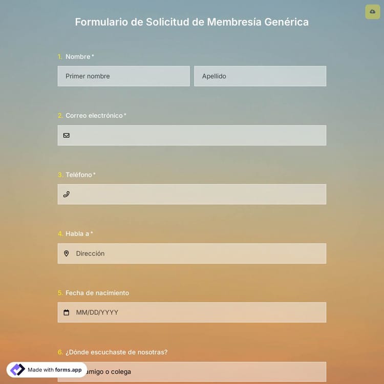 Esta muestra de formulario de registro incluye preguntas para recopilar información personal e información de contacto de los futuros miembros, como el nombre y el número de teléfono. Si tiene diferentes niveles para las membresías del club, podrá agregar estas opciones en el menú de edición. Además, este formulario cobrará las cuotas de membresía automáticamente. Todo lo que tiene que hacer es compartir su formulario en las redes sociales o incrustarlo en su sitio web. ¡Cree su formulario hoy mismo con la plantilla de formulario de solicitud de membresía genérica gratuita de forms.app!