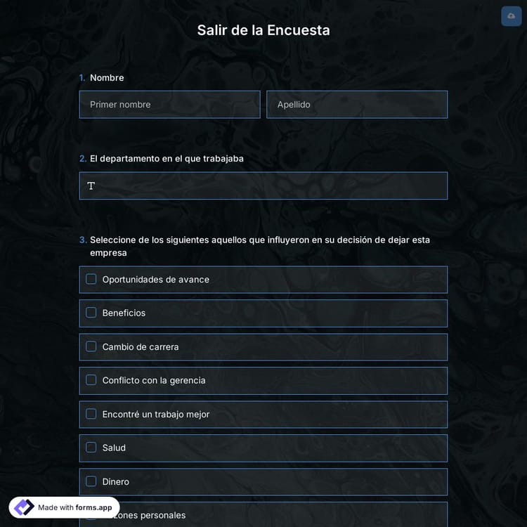 La plantilla de encuesta de salida del empleado es una excelente opción para recopilar comentarios sobre por qué los empleados se van. Comience de inmediato personalizando la plantilla de formulario o creando una desde cero con el creador de formularios de forms.app. ¡Su cuestionario de entrevista de salida estará listo en minutos!