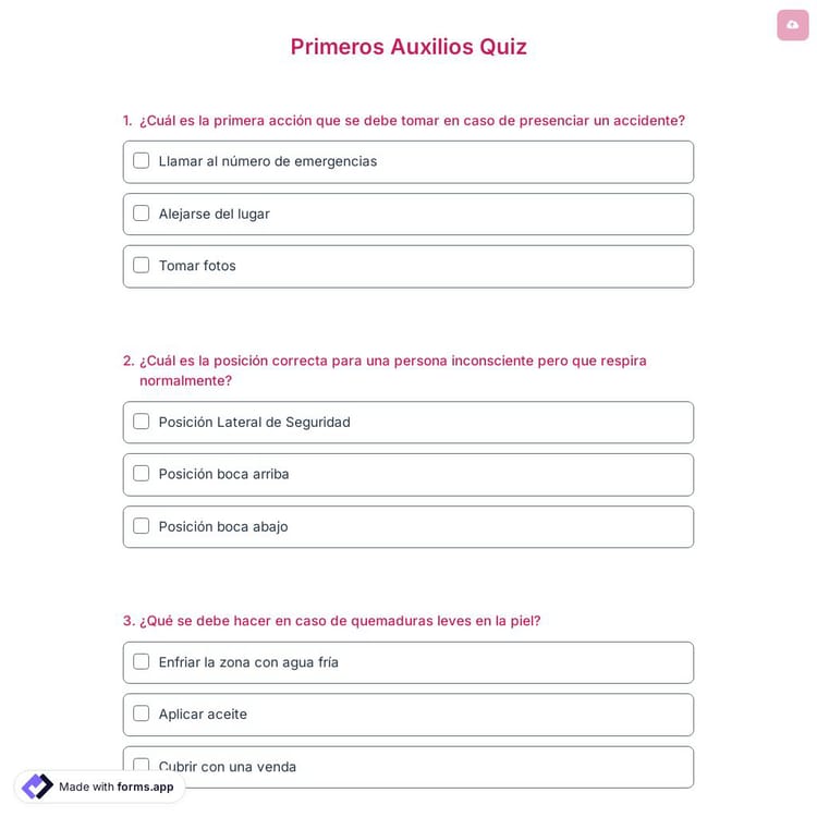 Crea un quiz en línea para evaluar el conocimiento en primeros auxilios de individuos o estudiantes que deseen convertirse en socorristas o profesionales de la salud e identificar las áreas en las que necesitan mejorar. Utiliza el modelo de quiz de primeros auxilios de forms.app y comienza a crear tu prueba!