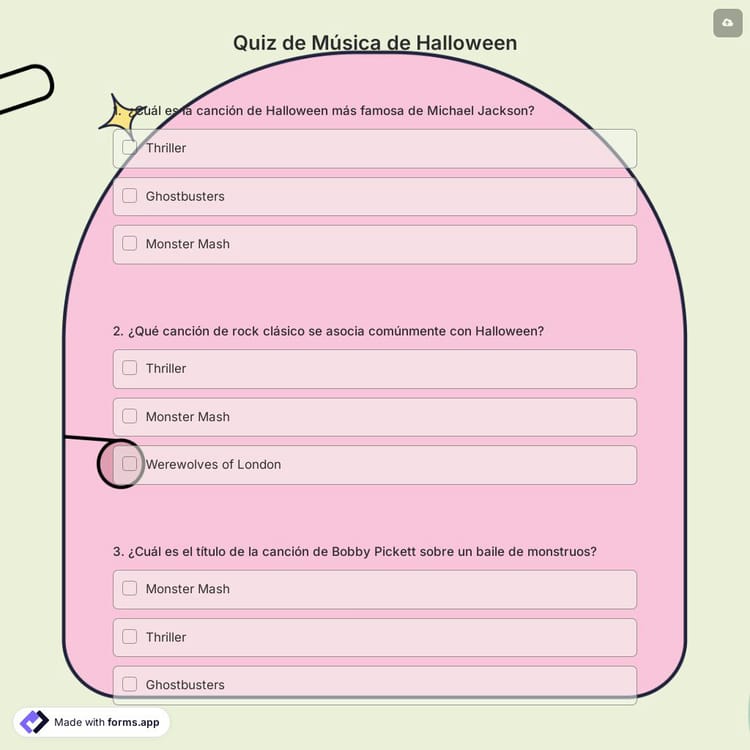 Un modelo de quiz musical de Halloween puede ayudarte a crear una actividad divertida e interactiva para tus alumnos. Los modelos de quiz son fáciles de usar y ofrecen numerosas posibilidades de preguntas divertidas sobre música para el aula. Un quiz en línea te permite publicar una pregunta en todas tus cuentas de redes sociales, hacer preguntas adicionales y crear un incentivo para que los participantes compartan y se involucren en el concurso.