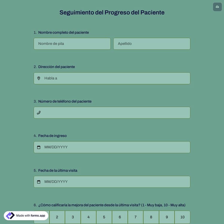 Seguir el progreso de los pacientes puede ser parte de su trabajo. En este caso, crear un formulario de seguimiento agiliza su trabajo y facilita la recopilación de información sobre los pacientes. Utilice este modelo de seguimiento del progreso del paciente y aproveche muchas funciones de forms.app.