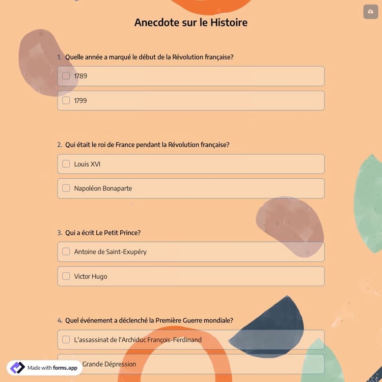 Créer des quiz gratuits sur l’histoire en ligne est un travail simple. Avec forms.app, vous pourrez créer un quiz en moins d’une minute. Utilisez ce modèle de quiz sur l'histoire pour commencer à créer votre quiz dès aujourd'hui; aucune connaissance en codage n’est requise.