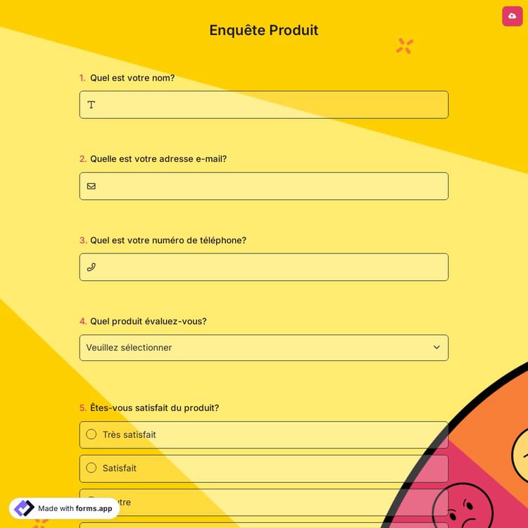 Les enquêtes sur les produits sont utilisées pour évaluer un produit à sortir ou un produit déjà sorti. Les questions d'une enquête produit visent à recueillir diverses opinions sur le produit, de l'idée du produit à l'emballage, du marketing à la politique des prix. Avec ce modèle d'enquête sur les produits fourni gratuitement par forms.app; vous pouvez mesurer les expériences des clients concernant votre produit et le développer ou l'ajuster en conséquence.