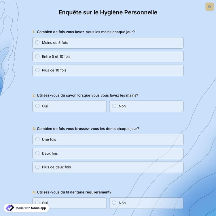 Les sondages sur l'hygiène personnelle peuvent fournir des informations sur les habitudes de soins quotidiens des personnes, la propreté des espaces de vie et le respect d'autres pratiques de prévention des infections. Le questionnaire peut être utilisé dans différents contextes pour surveiller et améliorer l'hygiène globale dans la communauté.