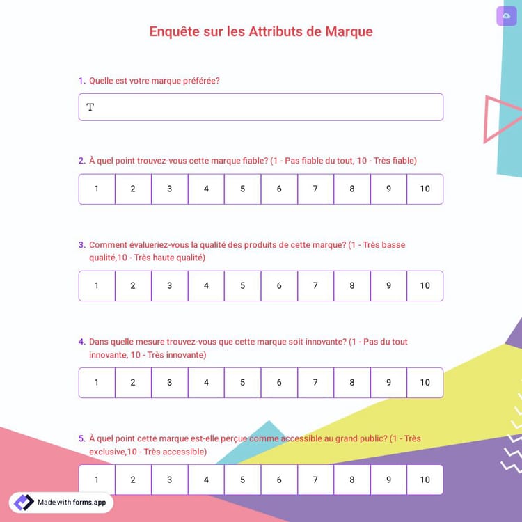 Le sondage sur les attributs de marque est un document en ligne qui aide les marques à comprendre comment les clients s'engagent et se rapportent à votre marque et à vos produits. Vous pouvez développer les produits et déterminer les stratégies marketing avec les réponses à ce sondage de recherche de marché. Vous pouvez créer votre sondage sur les attributs de marque en quelques secondes sur forms.app.