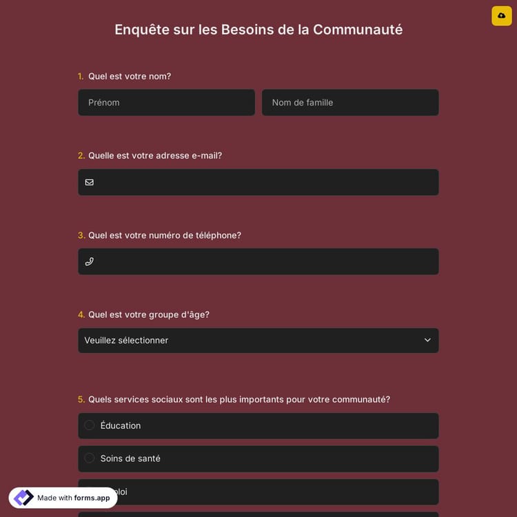 Le sondage d'évaluation des besoins de la communauté est réalisé pour déterminer les ressources et les besoins de la communauté. Il comprend généralement plusieurs questions sur les besoins fondamentaux tels que l'éducation et la santé. Vous pouvez obtenir ce modèle de sondage d'évaluation des besoins de la communauté sur forms.app et l'utiliser gratuitement !