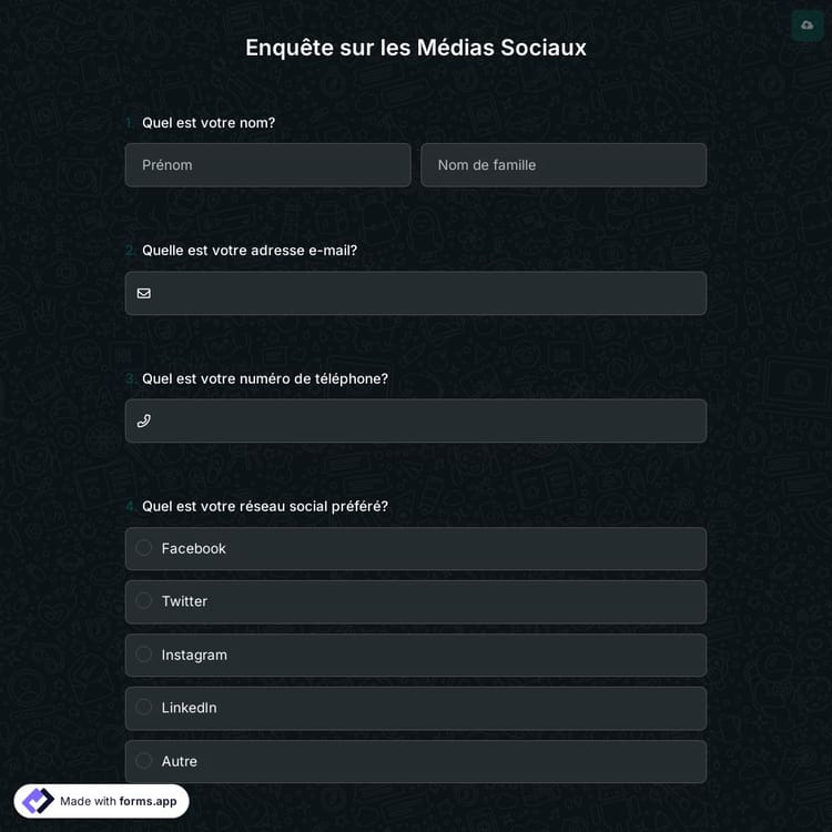 Apprendre les habitudes de médias sociaux de votre public cible est maintenant facile avec forms.app. Vous pouvez créer ou personnaliser des sondages sur les médias sociaux prêts à l'emploi, évaluer vos plans marketing et choisir facilement les clients adaptés à vos publicités. De plus, créer des formulaires et des sondages est gratuit avec forms.app.