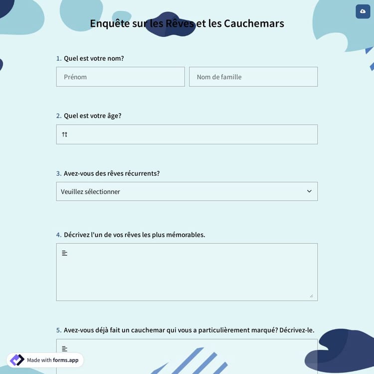 Le sondage sur les rêves et les cauchemars est un type de sondage utilisé par les psychologues et les psychiatres et préparé pour les personnes ayant des problèmes de sommeil. Avec ce modèle de sondage de recherche, les médecins peuvent découvrir quels types de rêves et de cauchemars les gens ont pendant leur sommeil et ce qu'ils en font.