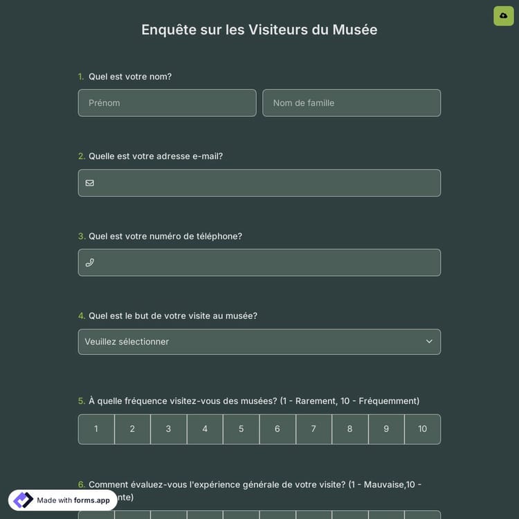 Un musée est populaire seulement si ses visiteurs y passent du temps de qualité… Et la meilleure façon d'assurer ce temps de qualité est de suivre de près et d'évaluer les conditions du musée. Commencez dès maintenant avec le modèle gratuit de sondage pour les visiteurs de musée sur forms.app !