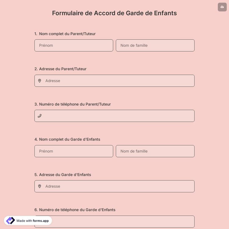 Allez-vous créer un formulaire d'accord de garde d'enfants ? Utilisez ce modèle de formulaire d'accord de garde d'enfants pour le personnaliser. Un formulaire d'accord de garde d'enfants est un document qui définit les tâches et les attentes des deux parties. forms.app rend ce processus facile et simple. Pour commencer à créer votre formulaire, cliquez simplement sur le bouton "Utiliser le modèle" ci-dessous.