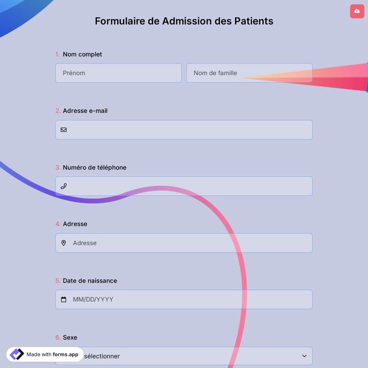 Un formulaire d'admission du patient est un document permettant de recueillir des détails médicaux sur le patient, tels que les maladies génétiques, les symptômes, les opérations passées. En créant un formulaire d'admission en ligne sur forms.app, vous pouvez facilement automatiser la collecte de données et gagner du temps. De plus, il est possible d’avoir votre formulaire grâce au modèle gratuit de formulaire d’admission des patients de forms.app. Alors, commencez dès maintenant et créez votre formulaire personnalisé dès aujourd’hui!