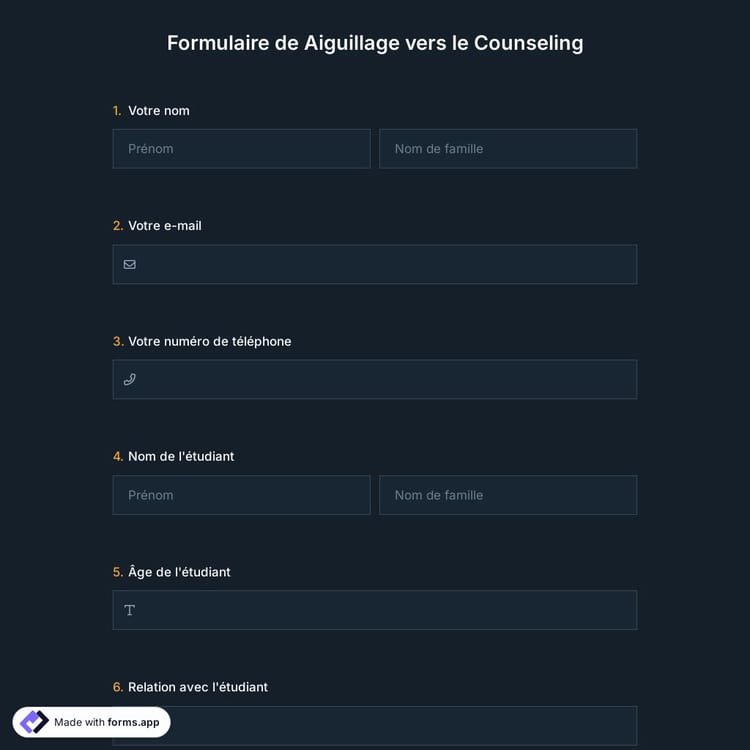 Si vous fournissez des services de conseil dans votre propre bureau ou dans une école secondaire, il est préférable d'avoir un formulaire de recommandation de conseil. De cette façon, les professeurs et les autres élèves pourront demander votre aide auprès d'un autre élève. Commencez à créer votre formulaire maintenant avec le modèle de formulaire de recommandation de conseils de forms.app!