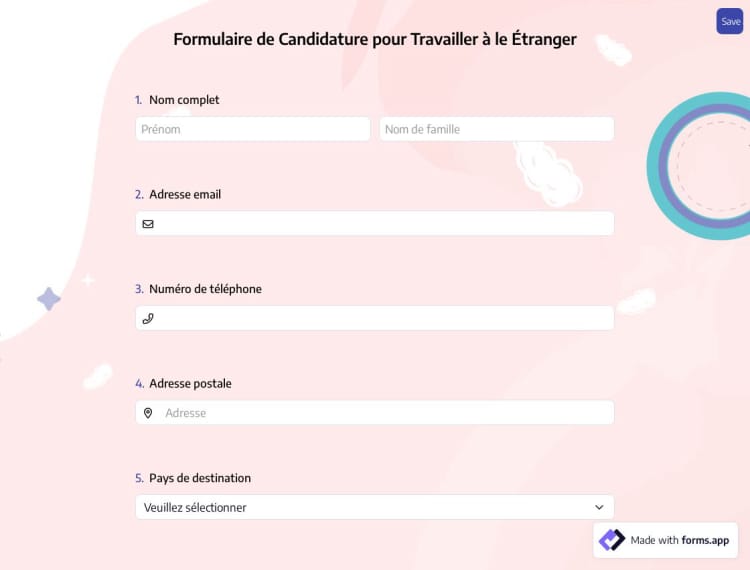 Vos travailleurs ont-ils besoin de travailler à l'étranger ? Alors vous avez besoin qu'ils remplissent un formulaire de demande de travail à l'étranger pour compléter les documents nécessaires. Il est facile de créer et de personnaliser votre formulaire avec forms.app et obtenir des informations supplémentaires n'est pas une tâche difficile avec un peu d'aide.
