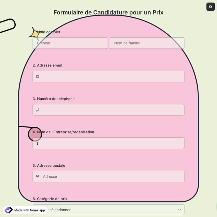 Ce modèle de formulaire vous aide à évaluer les nominations ou à vous nominer pour un prix. Les modèles de formulaire personnalisables de forms.app rendent la création de formulaire rapide et facile. Essayez les modèles gratuits dès maintenant pour créer un formulaire adapté à vos besoins!