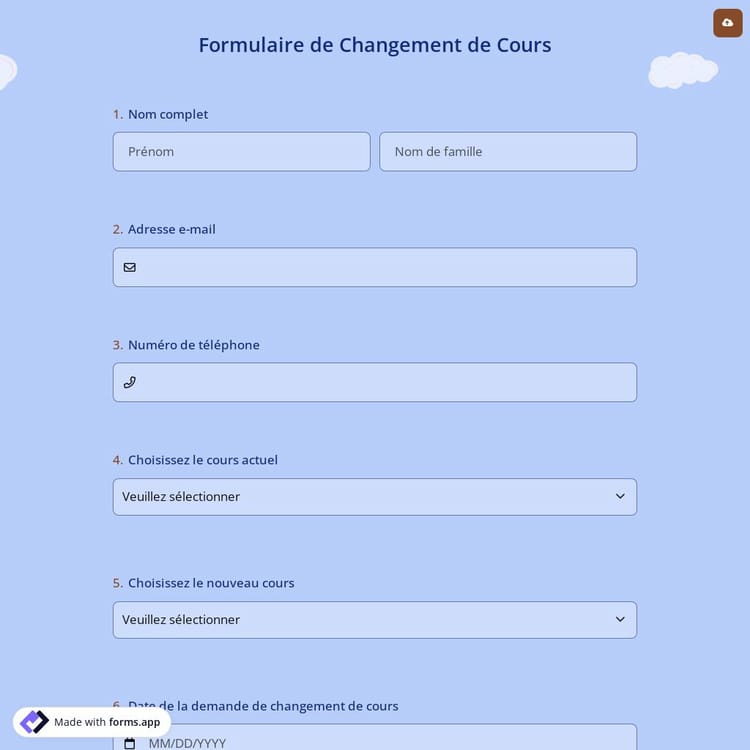 Le processus de changement de cours peut être problématique pour tout le monde, mais si vous utilisez forms.app, ce n'est pas compliqué du tout. Lorsque les étudiants veulent changer de cours, il leur suffit de remplir le formulaire de changement de cours que vous pouvez partager avec eux en ligne. Cliquez sur le bouton "Utiliser le modèle" ci-dessous et profitez de la création de votre formulaire de changement de cours en quelques secondes !