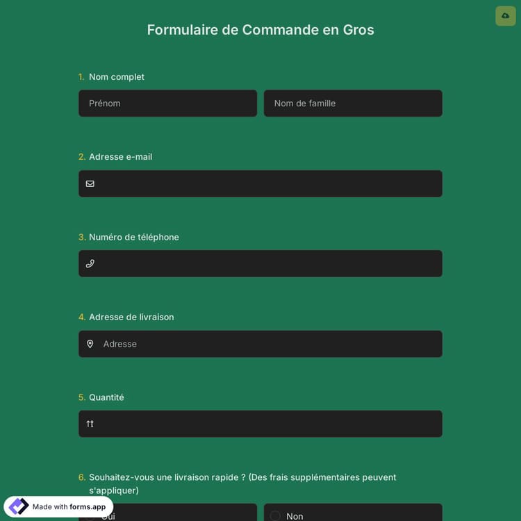 Un formulaire de commande en gros est un document utilisé par les propriétaires d'entreprises de vente en gros pour accepter les commandes de produits ou de services de leurs clients. Il contient généralement des informations sur les articles commandés, ainsi que les coordonnées et les détails de facturation du client. Les formulaires de commande en gros peuvent être créés à l'aide d'un générateur de formulaires en ligne, comme forms.app.
