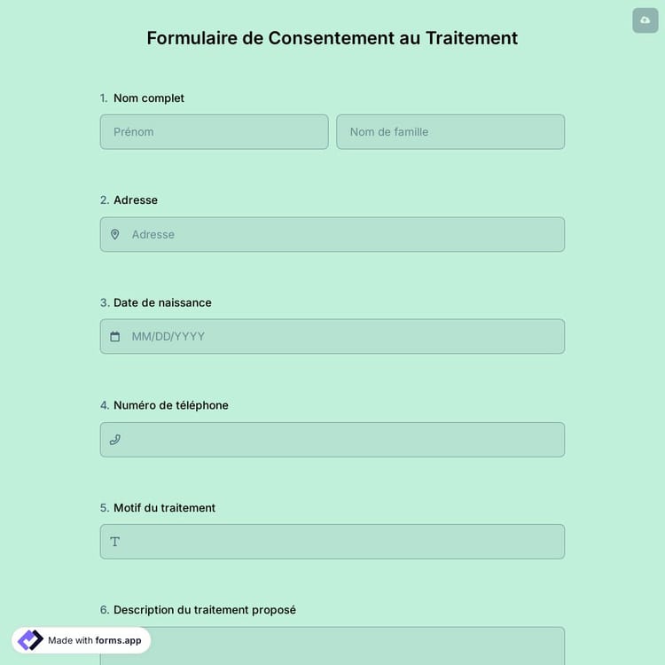 Les effets secondaires et le processus de certains traitements peuvent être difficiles pour la plupart des patients. Pour cette raison, les médecins doivent informer les patients de tous les détails du traitement à l'avance. Grâce à ce formulaire de consentement, vous pouvez obtenir un document de votre patient attestant qu'il/elle connaît et approuve tout ce qui concerne le traitement.