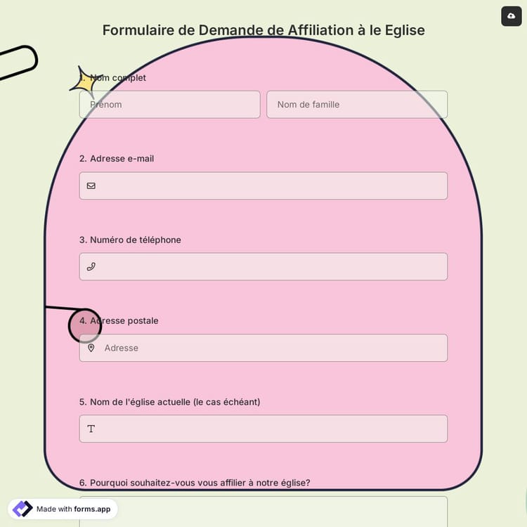 Avec le formulaire de demande d'affiliation à l'église, vous pourrez collecter facilement des demandes. Créez simplement des formulaires professionnels avec le modèle gratuit de formulaire de demande d'adhésion à l'église de forms.app. Ne tardez pas et commencez dès aujourd'hui à créer des formulaires parfaits pour votre église !