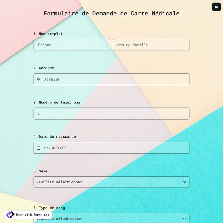 Les professionnels de la santé enregistrent les patients pour une carte médicale à l'aide d'un formulaire de demande. Vous pouvez recueillir les informations personnelles des patients pour votre pratique médicale en utilisant un formulaire de demande de carte médicale en ligne gratuit ! Personnalisez le formulaire pour collecter les données dont vous avez besoin, offrez un lien ou faites remplir le formulaire en personne dans votre cabinet. Créé par forms.app Team
