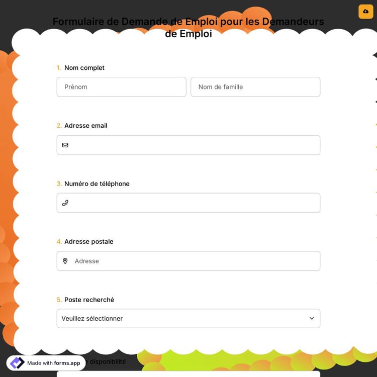 Un formulaire de demande d'emploi est un document en ligne utilisé pour recueillir les informations des demandeurs d'emploi afin de les aider dans leur recherche d'emploi. Vous pouvez intégrer ce formulaire de demande en ligne sur votre site web, où les gens peuvent facilement postuler, ou le partager sur vos réseaux sociaux.