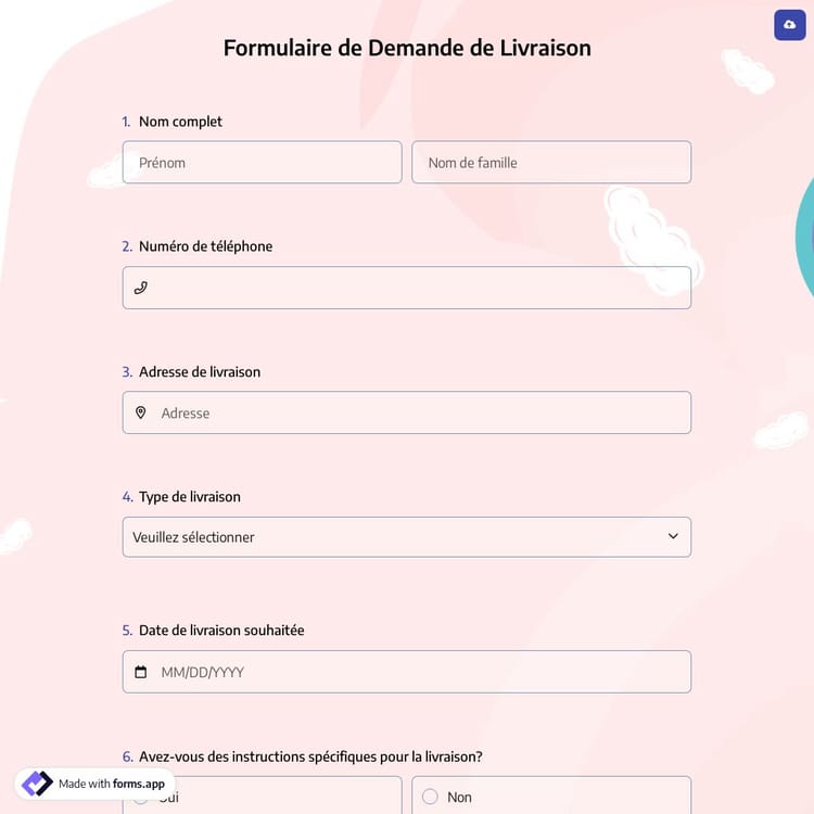 Utiliser un formulaire de demande de livraison en ligne est un moyen très simple de collecter des demandes en ligne pour votre entreprise. Si vous avez besoin de données de base du client pour la livraison, vous pouvez créer un formulaire de demande de livraison en utilisant forms.app. Vous pouvez faciliter le travail de votre entreprise en cliquant simplement sur le bouton "Utiliser le modèle" ci-dessous !