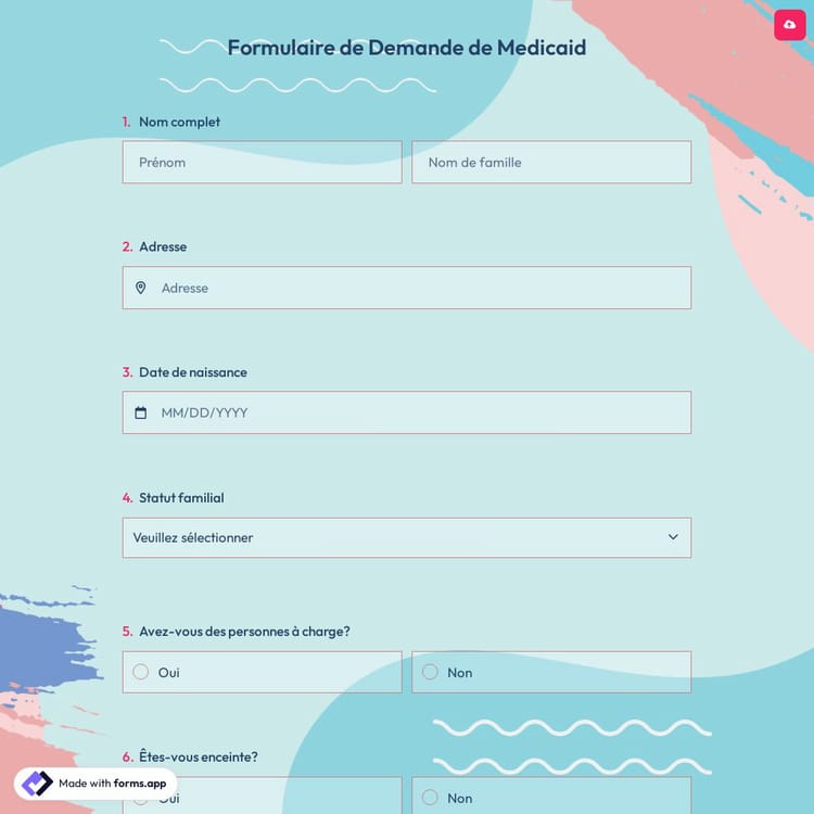 Vous pouvez collecter des demandes de personnes à faible revenu et handicapées avec ce formulaire de demande de Medicaid. forms.app peut vous aider à numériser votre organisation de soins de santé et à collecter et gérer plus efficacement des données. Il existe deux méthodes de base pour s'inscrire: les formulaires papier ou les formulaires en ligne. Aujourd'hui, il est évident que l'utilisation de formulaires d'inscription en ligne simplifie grandement la procédure d'inscription. Créé par forms.app Team