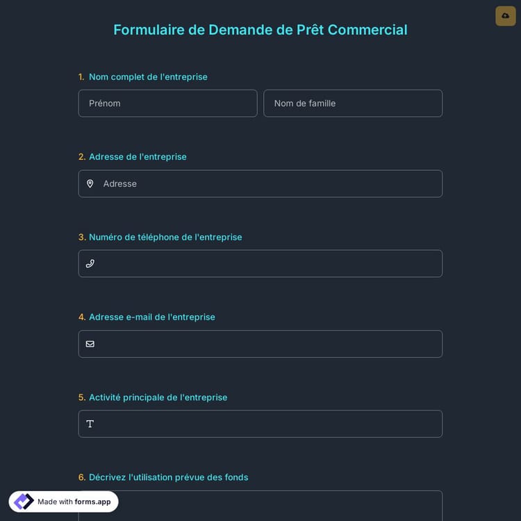 Lorsqu’il s’agit de demander un prêt commercial, de nombreux documents et formalités sont nécessaires. Cela peut être fastidieux et prendre beaucoup de temps, surtout si vous n'êtes pas familier avec le processus. Cependant, en utilisant un modèle de formulaire en ligne, tel que ce formulaire de demande de prêt commercial sur forms.app, vous pouvez rationaliser le processus et obtenir les informations dont vous avez besoin rapidement et facilement. Voici quelques informations que vous pouvez demander à vos emprunteurs dans un formulaire en ligne: