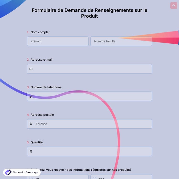 Cette formulaire de demande de renseignements sur le produit est gratuite et personnalisable